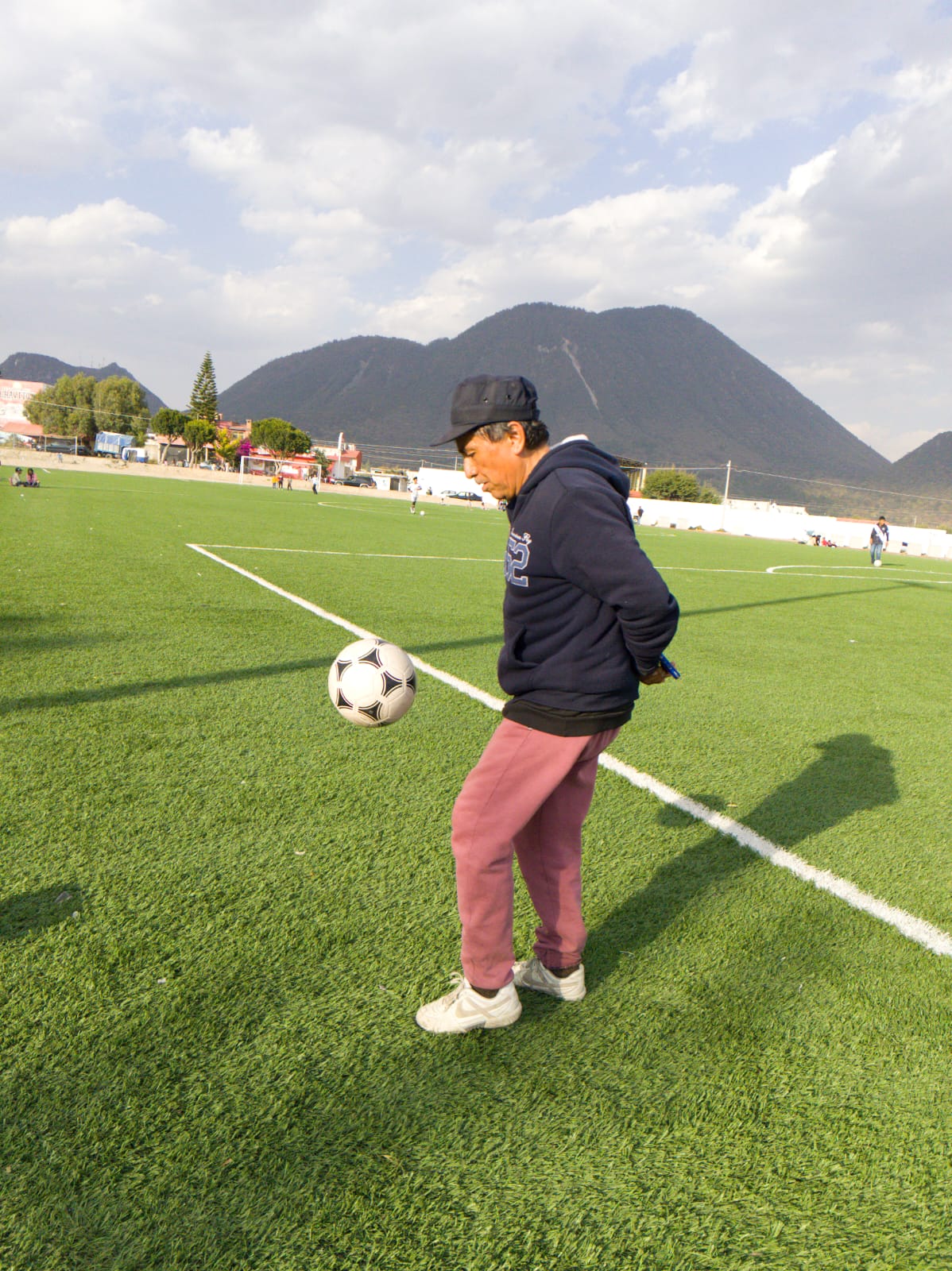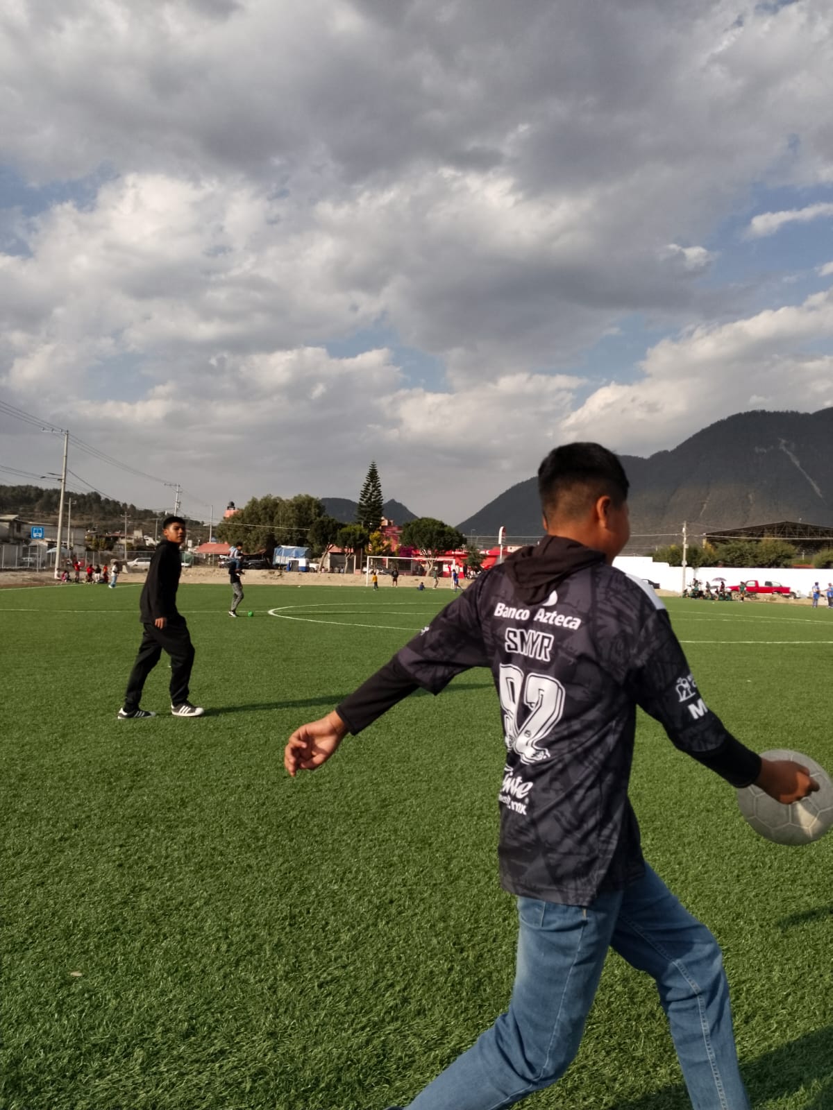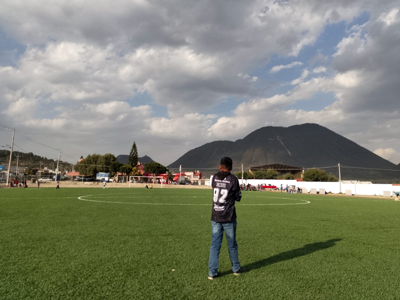 La fotografía muestra una cancha de fútbol con una persona en primer plano (de espaldas), observando hacia el campo, fondo se ve un pueblo con casas, personas, árboles y una montaña prominente bajo un cielo parcialmente nublado, la técnica usada fue profundidad de campo con apertura de diafragma (f/8), esta fotografía no busca destacar solo al sujeto, sino capturar la totalidad del momento y el paisaje: el campo, la comunidad, la montaña, el cielo, foto tomada con cámara V30lite, fecha de creación 23/03/25.