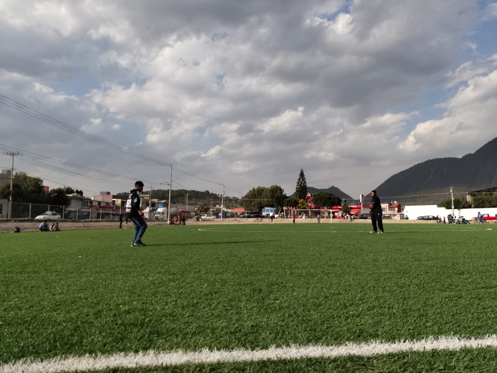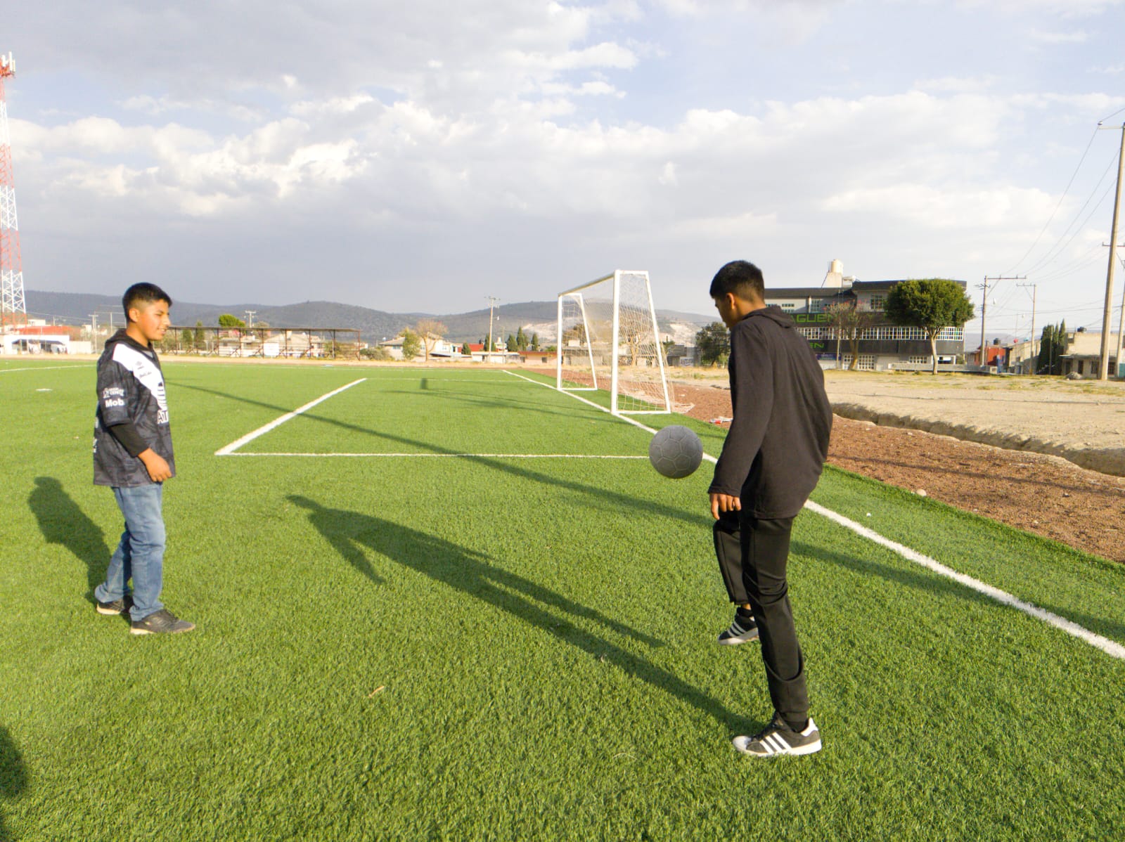 En esta nueva imagen, también se utiliza una profundidad de campo amplia, se observa a dos jóvenes en una cancha de fútbol, al fondo se observa un cielo nublado, unas montañas y arboles, se utilizó una apertura de diafragma de (f/8) , foto tomada con cámara V30lite, fecha de creación 23/03/25.