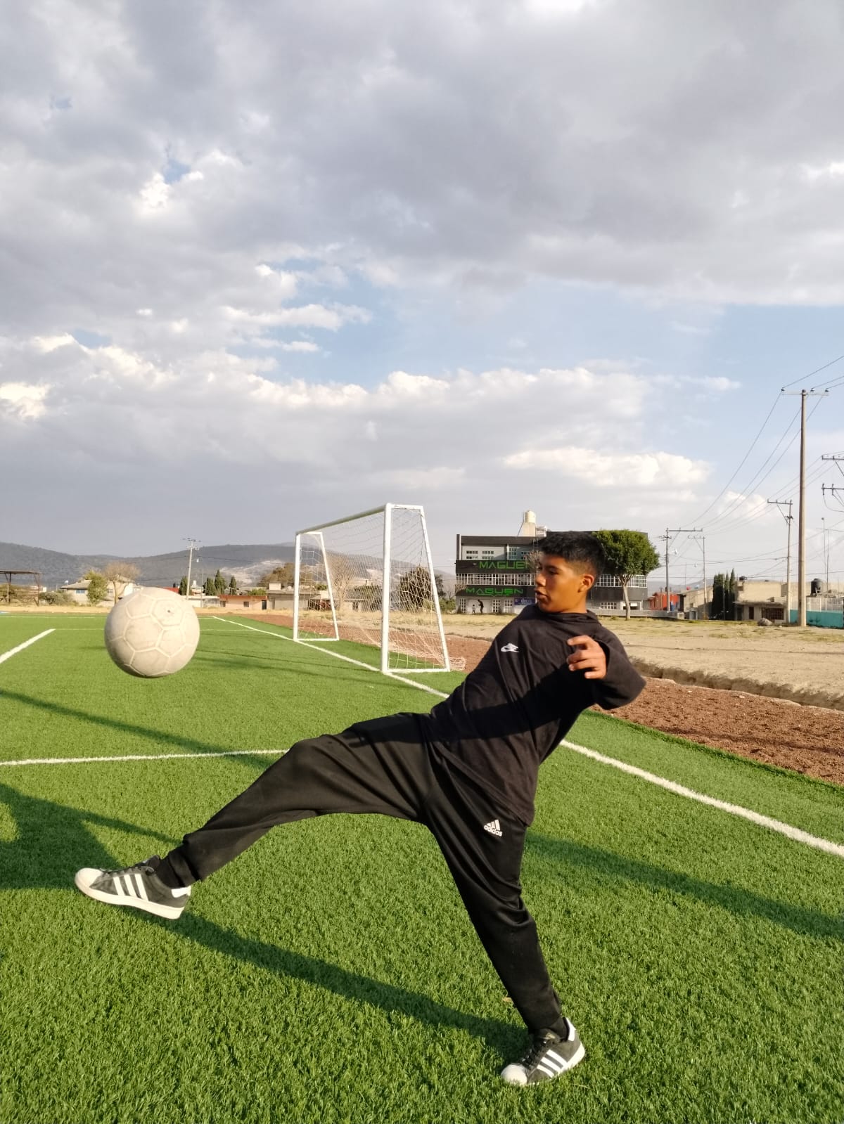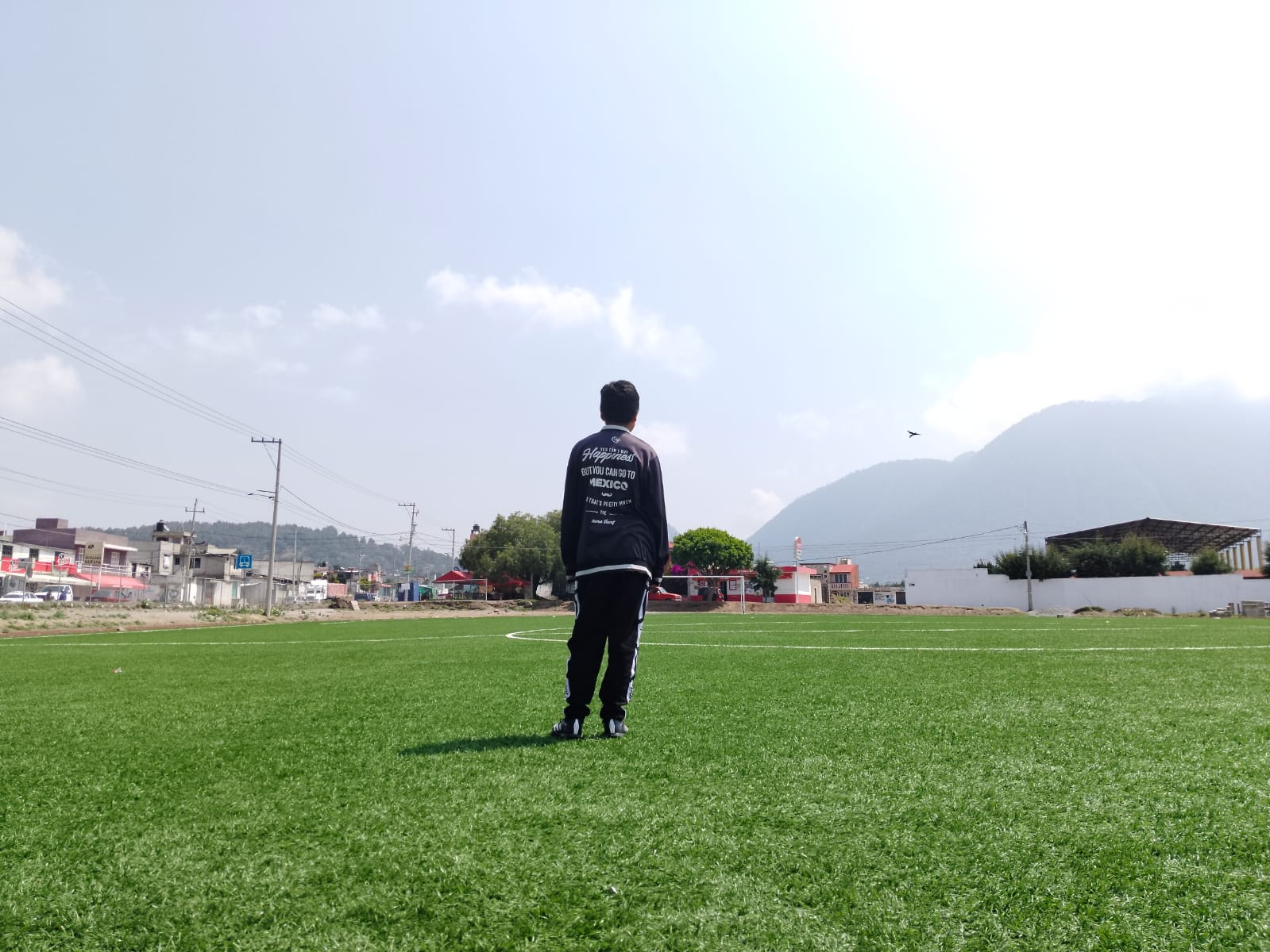 La profundidad de campo amplia permite que todos los elementos, desde el primer plano hasta el fondo, sean visibles y reconocibles, muestra a un joven de espaldas al centro de un campo de fútbol, observando hacia el horizonte, el entorno incluye casas, árboles y una montaña al fondo parcialmente cubierta por neblina o luz intensa. El cielo está parcialmente nublado y hay un ave volando, foto tomada con cámara V30lite,fecha de creación 03/05/25.