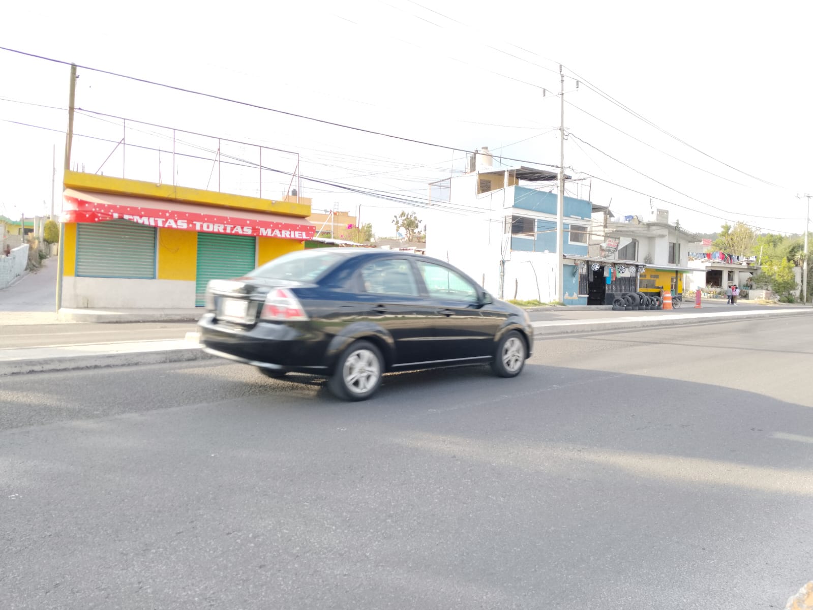En esta foto observamos un coche color negro, pasando por la carretera, la técnica usada fue velocidad de obturación lenta (1/200s), por lo que no congela bien el movimiento, foto tomada con cámara V30lite, fecha de creación 23/03/25.