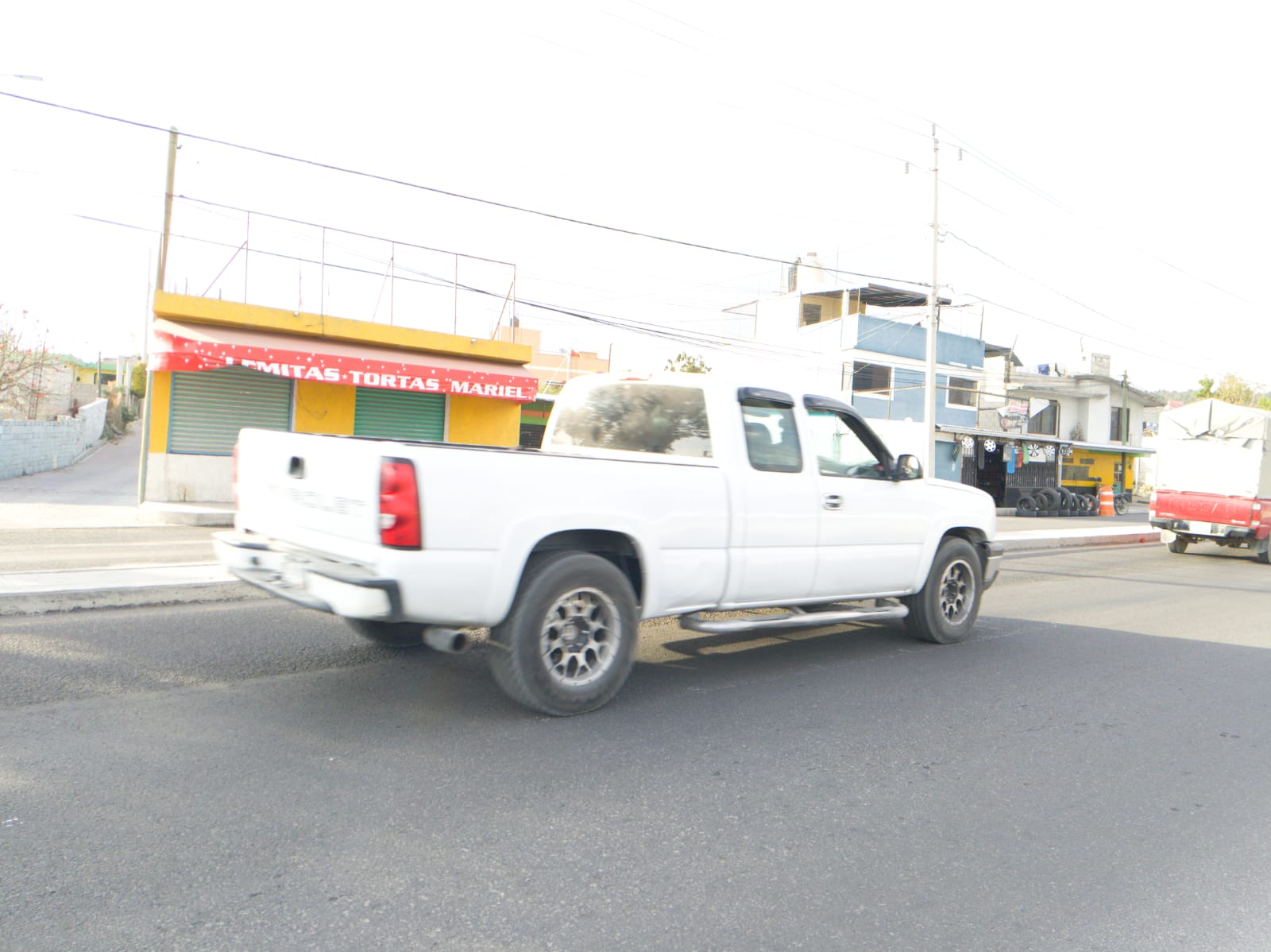 Se observa una camioneta blanca, y enfrente una parte de una camioneta roja, el cual el movimiento no se logra congelar, ya que se usa la velocidad de obturación lenta (1/200s), foto tomada con cámara V30lite, fecha de creación 23/03/25.