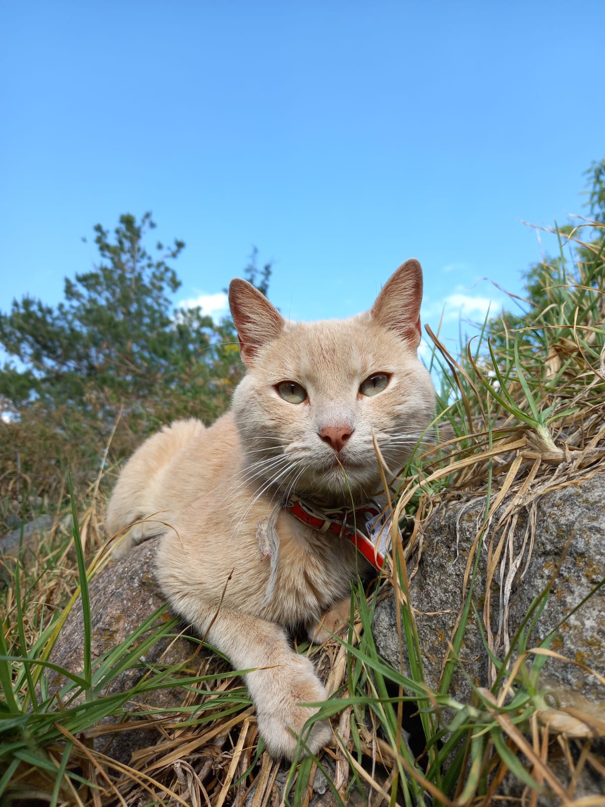 Se observa a un gato encima de unas piedras y pasto, la técnica usada fue regla de tercios, en el tercio inferior se observa una parte de su pata y pecho, en el tercio medio observamos su cara y la parte de su cuerpo, en el tercio superior se observa el cielo y una parte del árbol, foto tomada en cámara V30lite,fecha de creación 09/03/25.