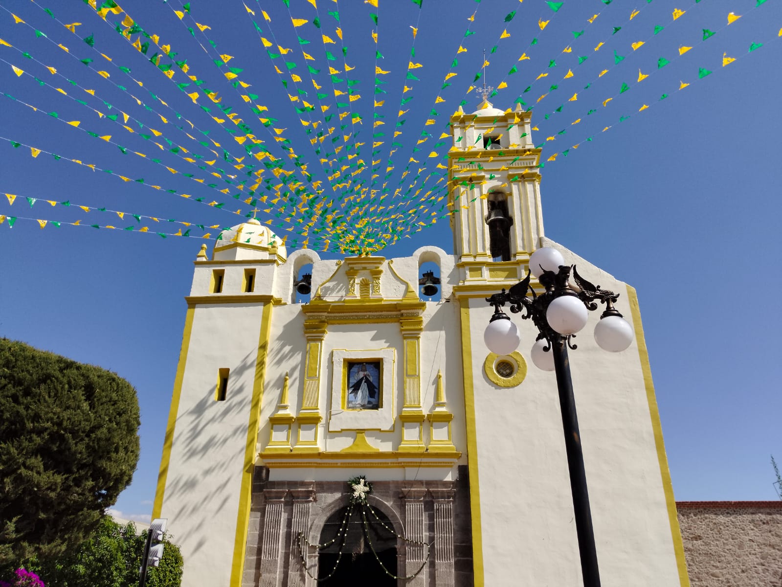 En la siguiente foto, se observa una iglesia, la técnica usada fue regla de tercios, en el tercio inferior se observa parte de la puerta central, y parte de la iglesia, un árbol, en el tercio medio se ve otra parte de la iglesia y una imagen de algún santo, igual se observa una parte de una lampara, y por ultimo en el tercio superior se aprecia la ultima parte de la iglesia, parte del cielo y unos adornos de colores, foto tomada en cámara V30lite,fecha de creación 09/03/25.