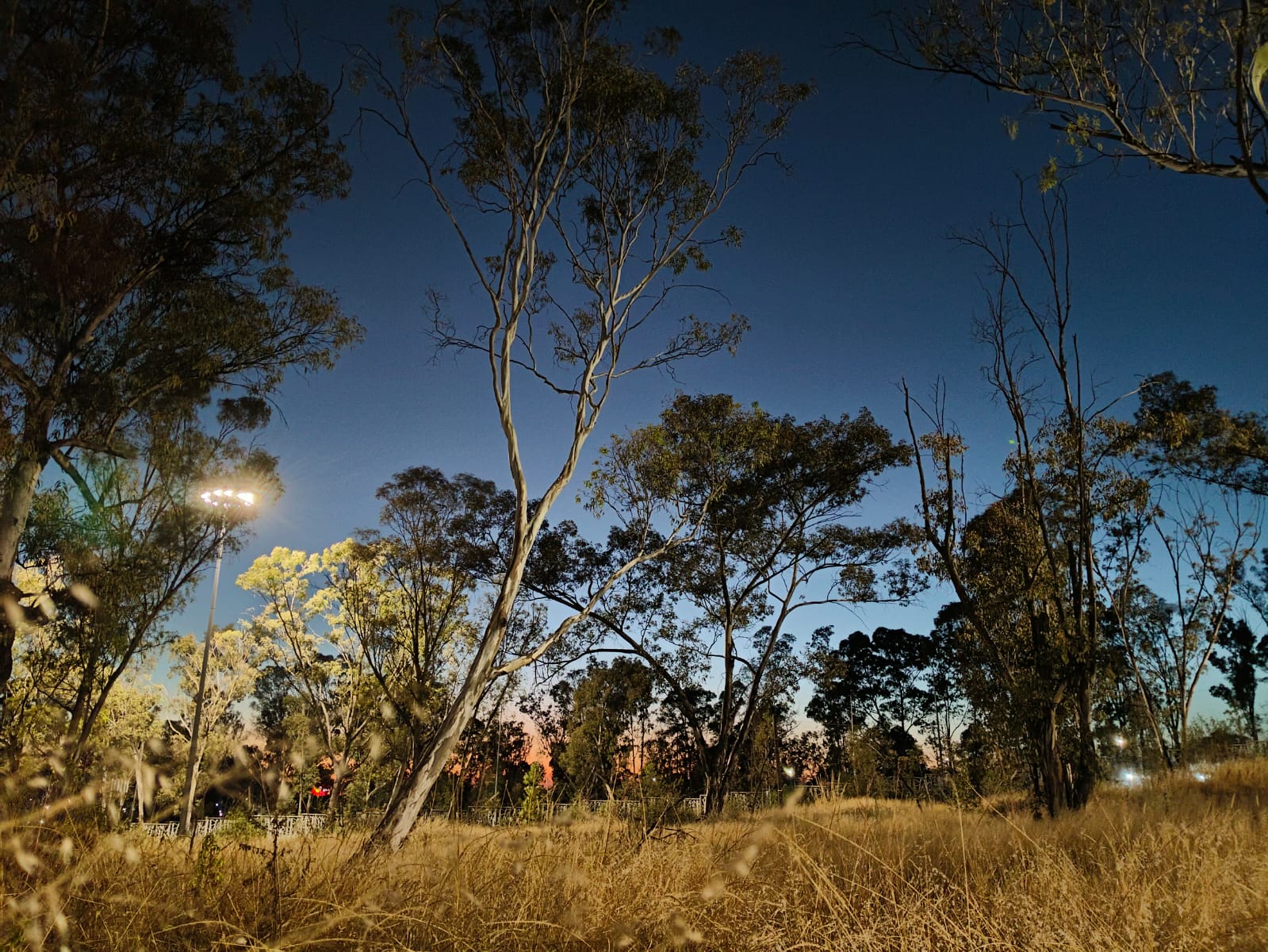 Esta fotografía muestra un paisaje natural con árboles altos y pasto seco, está fotografía muestra un paisaje natural con árboles altos y pasto seco, en el tercio superior vemos pasto seco y enmarañado, con algunas semillas, en el tercio medio troncos y ramas de los árboles principales, algunos postes y luces, en el tercio superior cielo en tonos azulados, ramas superiores de los árboles, foto tomada con V30lite, fecha de creación 02/05/25.
