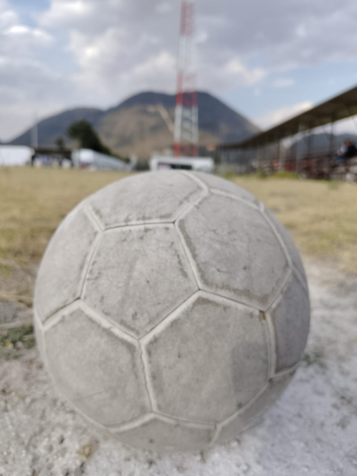 En esta fotografía se observa un balón de fútbol en primer plano completamente enfocado, mientras que el fondo (una torre, las gradas, la montaña y el cielo) aparece desenfocado.