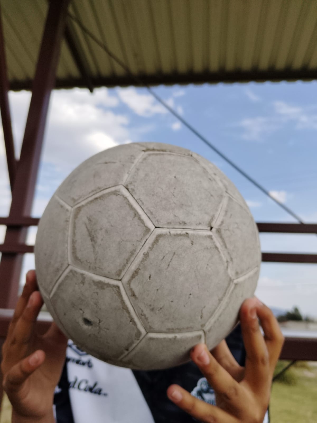 En esta foto se observa un balón de fútbol en primer plano sostenido por un niño, completamente enfocado, el fondo, que incluye una estructura metálica y el cielo, aparece desenfocado.