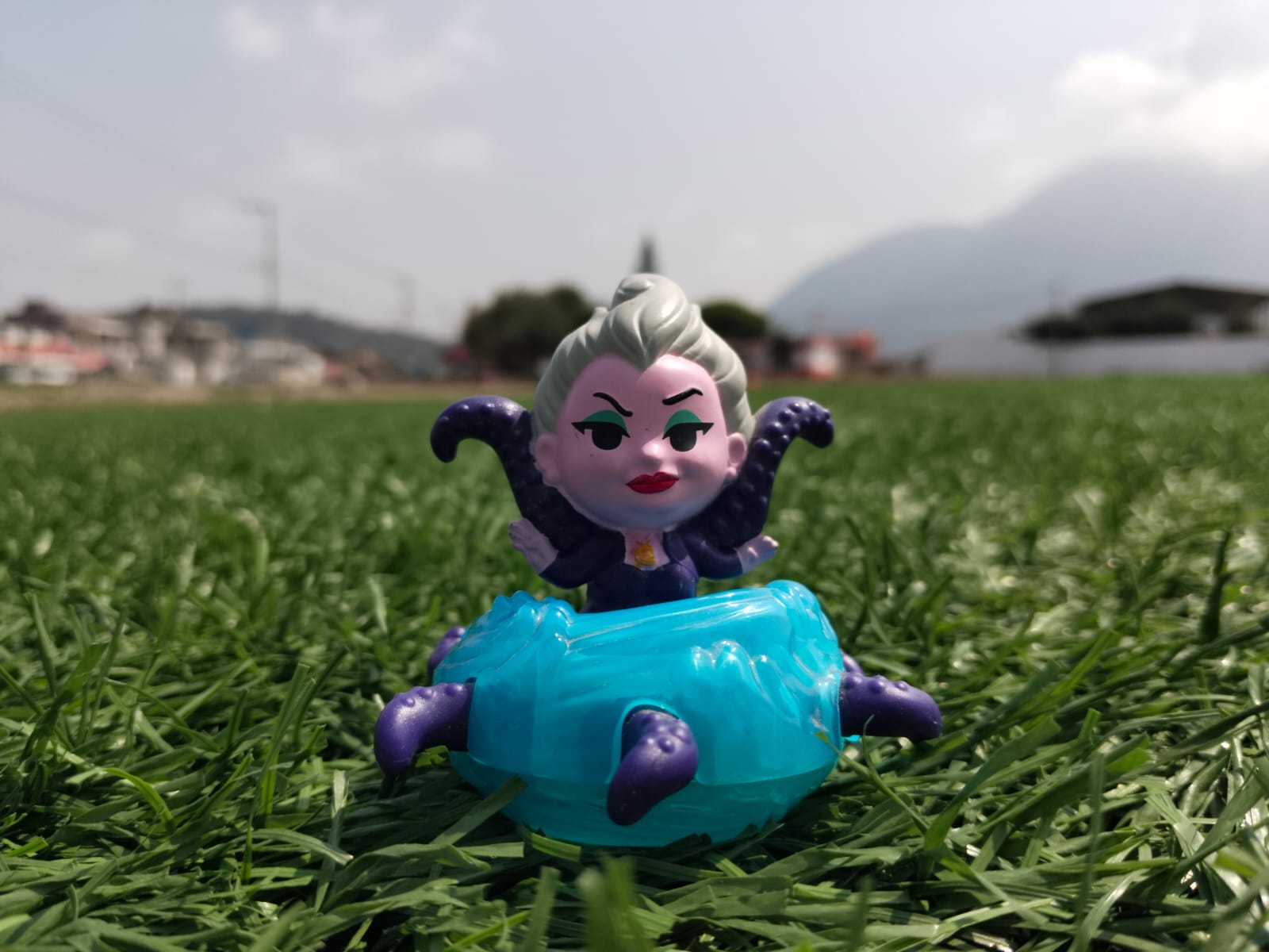 La foto muestra una figura de juguete (Ursula, de Disney) claramente enfocada en primer plano sobre el césped, mientras que el fondo —que incluye casas, árboles y montañas— aparece completamente desenfocado.