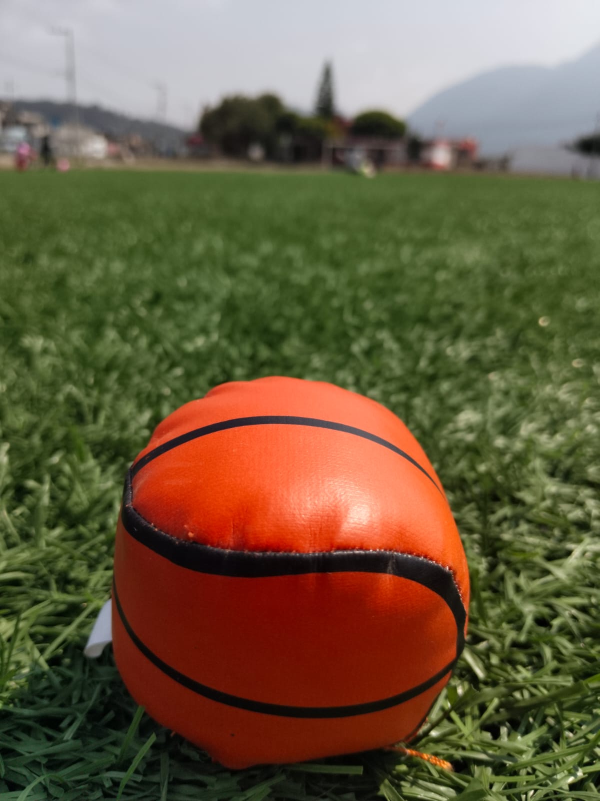 La foto muestra una pequeña pelota de baloncesto en primer plano, con gran nitidez y detalle sobre el pasto, el fondo que incluye una cancha, árboles y montañas está completamente desenfocado.