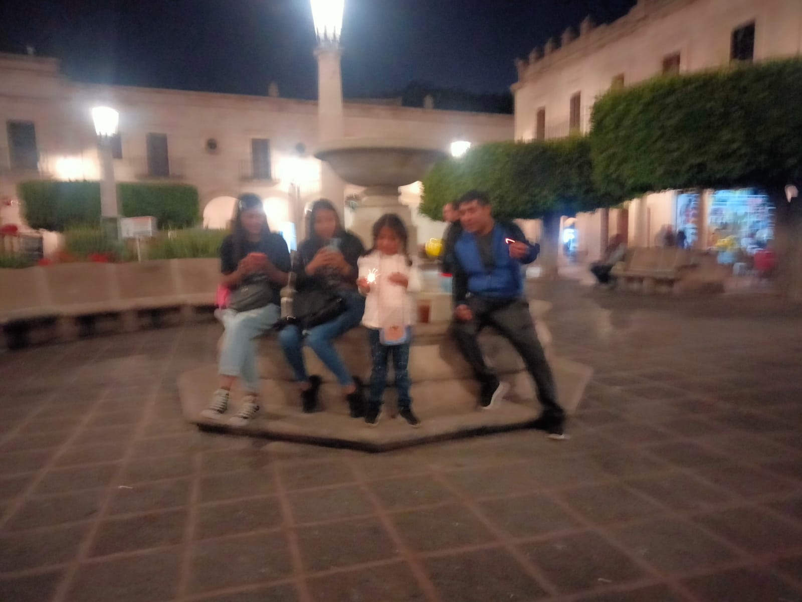 Fotografía nocturna en una plaza pública donde un grupo de personas posa junto a una fuente. La foto presenta desenfoque por movimiento, es un ejemplo de velocidad de obturación lenta (1/50s), donde el movimiento de las personas ha generado desenfoque, foto tomada con cámara V30lite, fecha de creación 20/04/25.